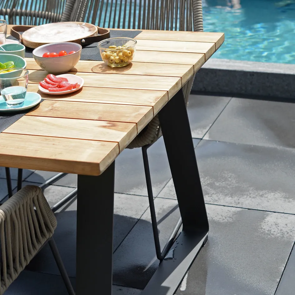 Ein Tisch mit einer Tischplatte aus Teakholz sieht in allen Arten von Gartenstilen gut aus. Modern, naturbelassen oder klassisch... Teakholz passt eigentlich zu allem. Es fühlt sich warm und weicher an als beispielsweise eine Tischplatte aus Aluminium, Keramik oder HPL. Natürlich braucht es etwas mehr Pflege, aber mit den richtigen Pflegeprodukten ist das ein kleiner Aufwand.
